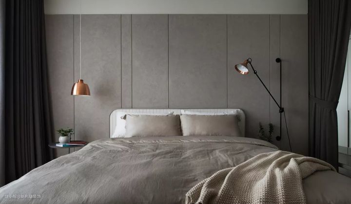 ▲ 卧室,床头墙与床铺形成灰-白-灰的层次过渡,结合不对称的床头布置,在提升活跃度的同时,也将高级灰的低调优雅发挥到极致。
