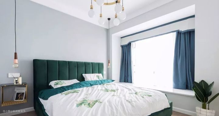 ▲ 床头设计了半高矮墙,方便收纳常用的物品,窗帘与床品同一色系,蓝色营造静谧舒缓的睡眠空间。