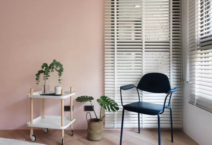 ▲ 卧室的白色和粉色撞色墙面,很大气,再加上木质斜纹人字形铺满的地板,很时尚高档。