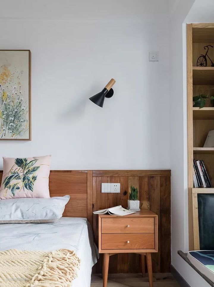▲ 卧室没有过多的装饰,一边木质小吊灯、一边伸缩壁灯,躺在床上各有一片空间来做自己想做的事。