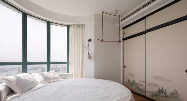 ▲ 特意挑高的门洞几乎延伸至头顶,视觉上更为狭长开阔,让整个卧室更舒朗,空间一点不显逼仄。