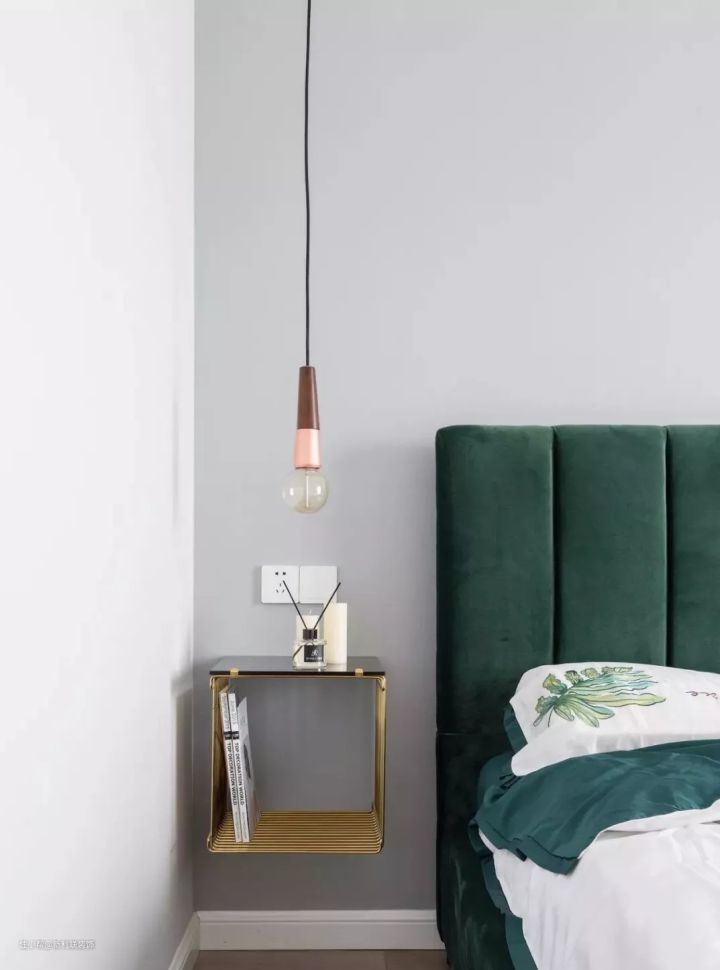 ▲ 墨绿色大床搭配架空式床头柜,金色元素提升质感。