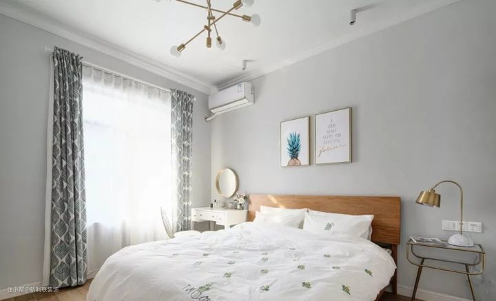 ▲ 卧室内以灰色为主,搭配一盏树枝造型铜艺灯,原木床铺了清新文艺的床单,加上几何图形的灰白色窗帘点缀,给人舒适放松的氛围感。