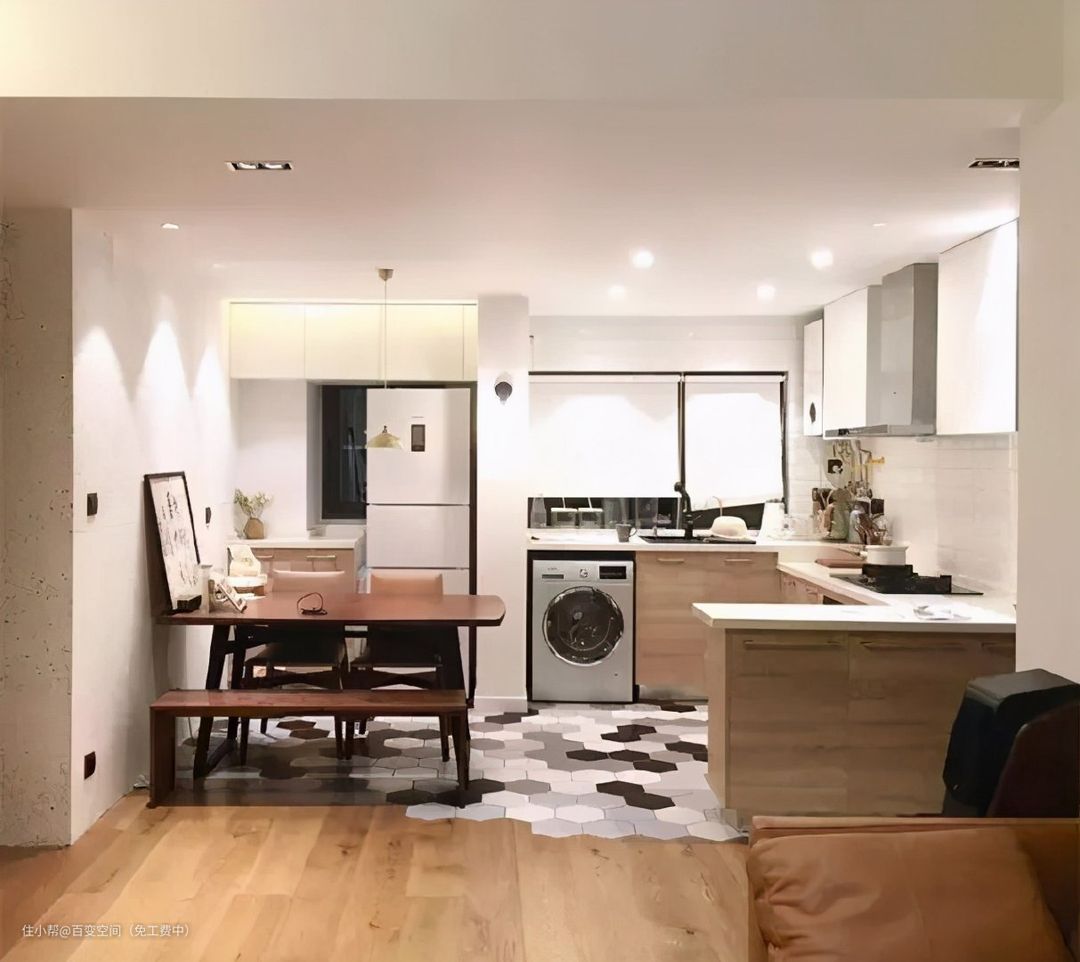 另外,除了阳台,还能将洗衣机放在厨房。有的朋友看到这个操作,可能会感到惊讶。但其实,在西方国家很多家庭都是把洗衣机放在厨房的,不过由于中国人的厨房油烟都是比较严重的,所以大家没有这样操作过。