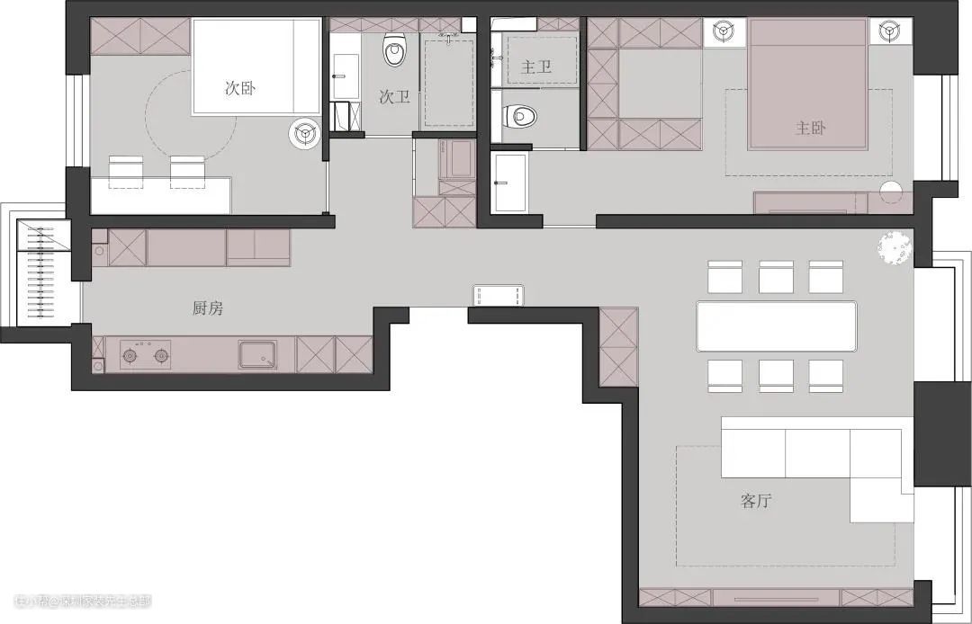3.考虑到主卧室的浴室太大,两人的衣服很多,减少了浴室面积,增加了衣帽间。