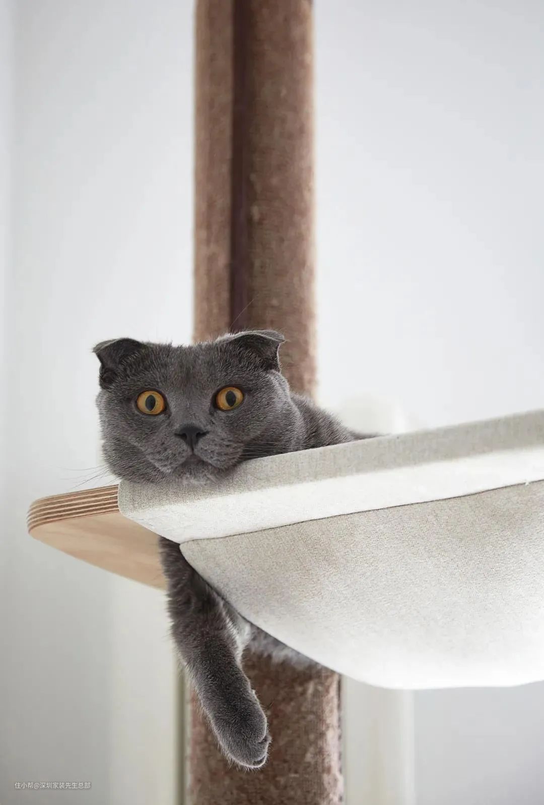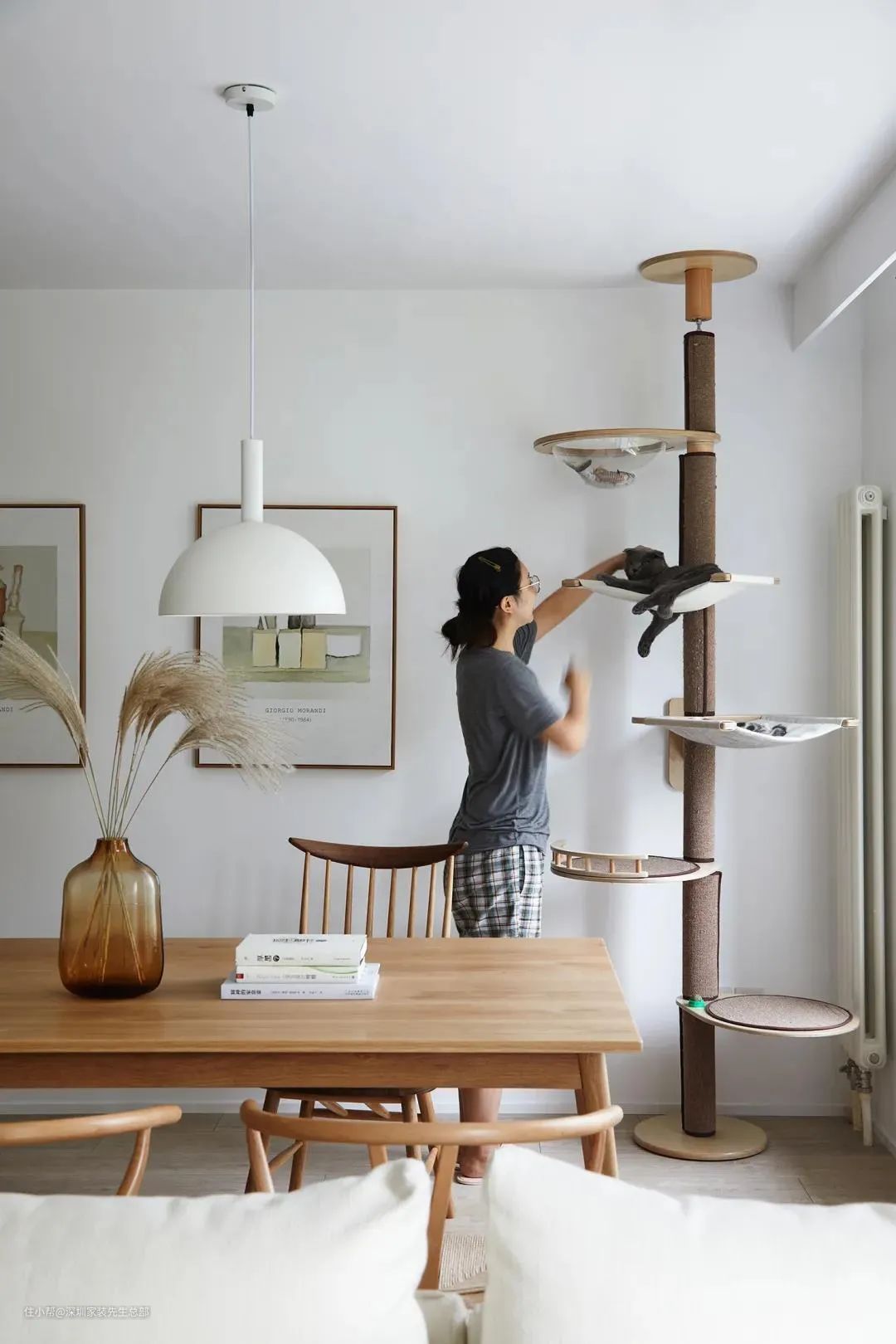 天然温暖的木质底座与白色和浅灰色相结合,带来舒适和愉悦的自由感。窗台旁边的猫爬架为两只猫提供了一个有趣的休息区并为房间增添了温暖的感觉。