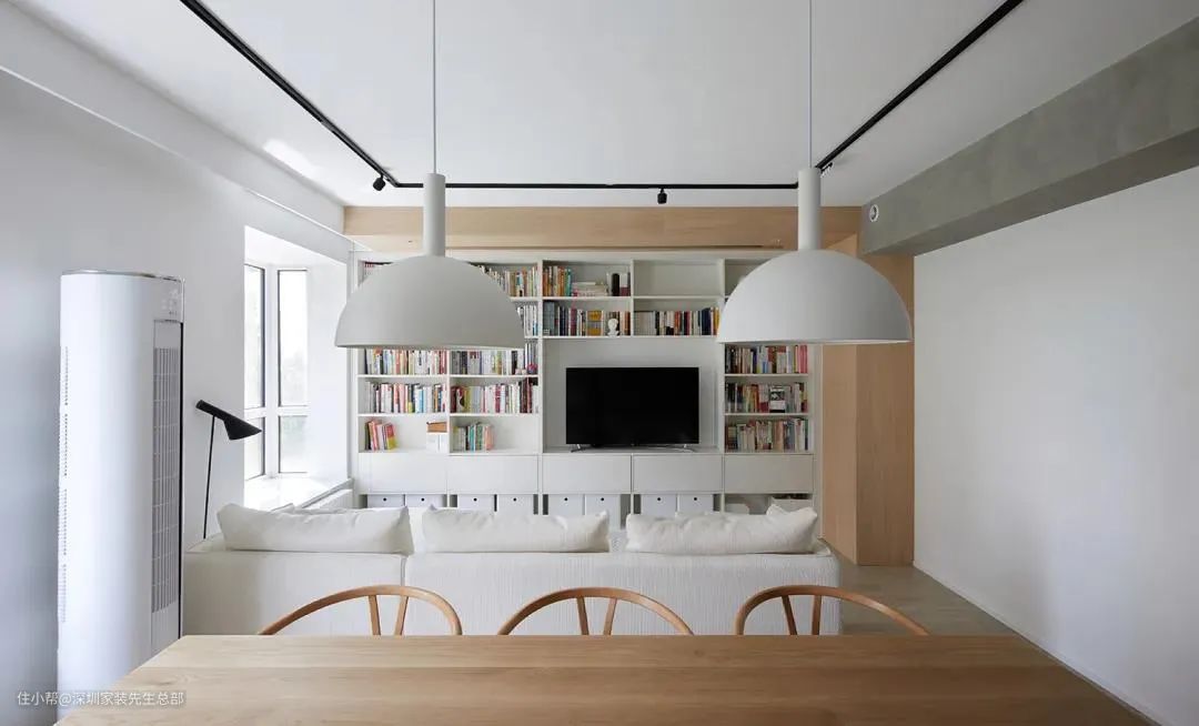 2.通过白色书柜的颜色形成深度对比,丰富视觉变化。