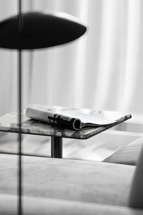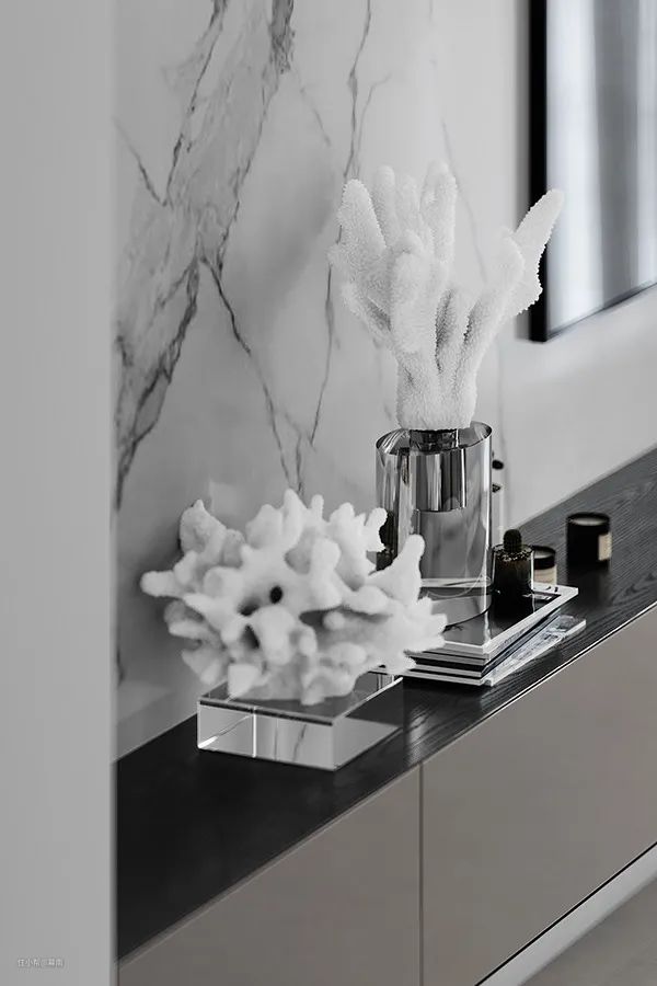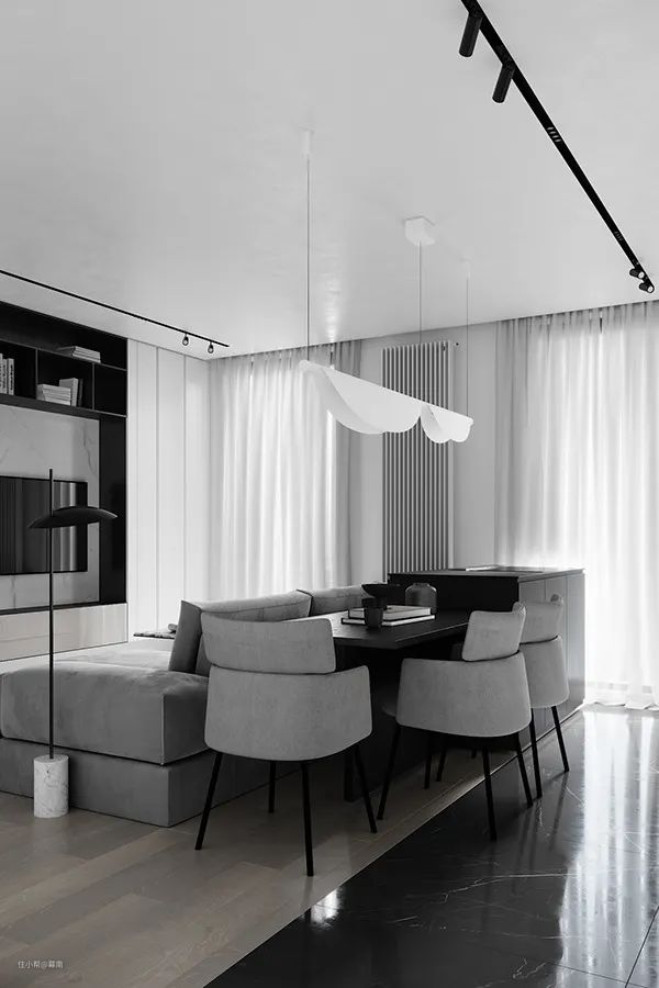 客厅的黑白灰配色,奠定高度理性的空间基调,浅灰色大理石纹的电视墙,提升空间整体质感,利落的线条搭配上精致的家具,开阔的空间为整个设计带来极致舒适的感觉。客厅中没有多余的色彩,显得高级又耐看。