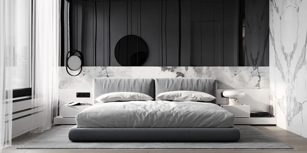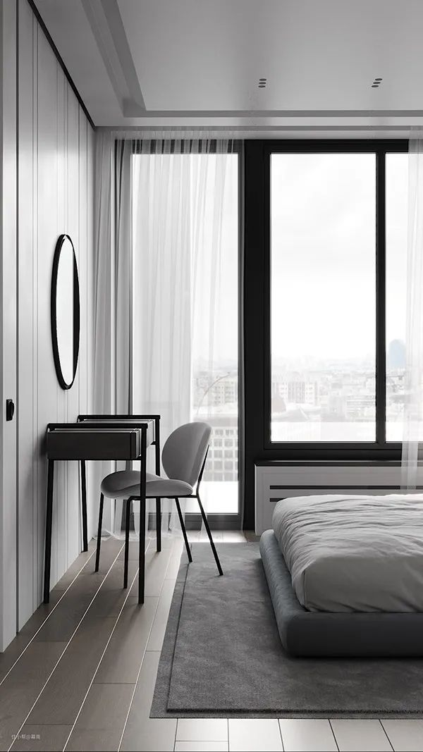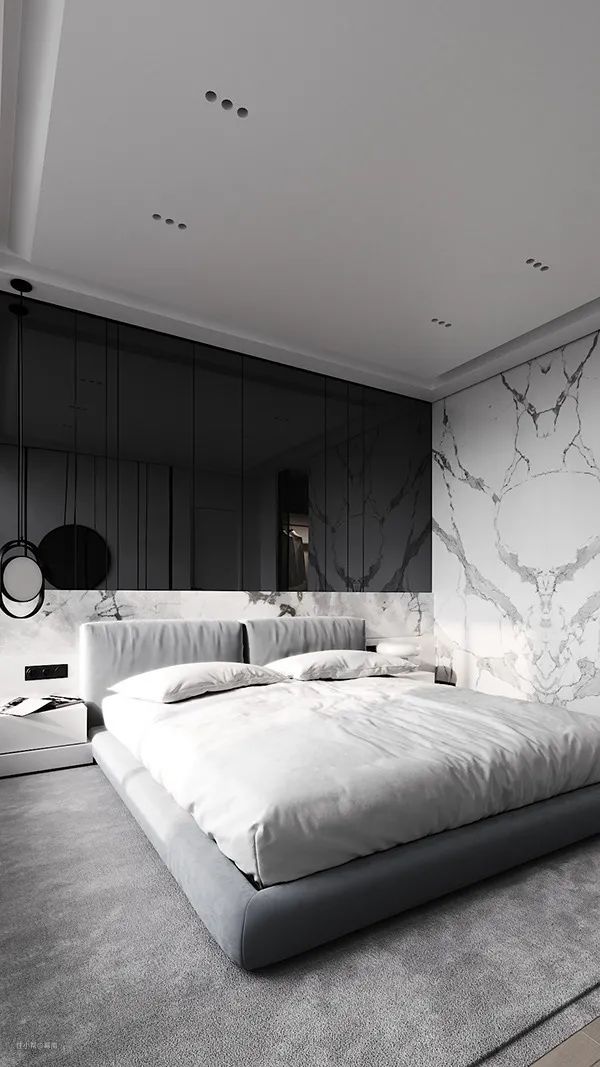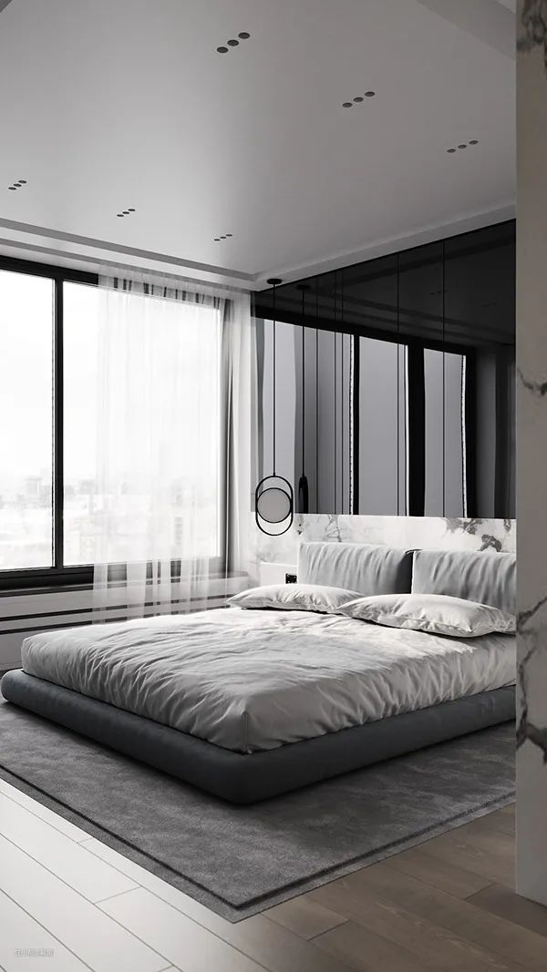 卧室中用白色与浅灰色作为主要配色。白色大理石纹墙壁与黑色瓷砖拼接,展现精致的现代气质。大面的落地窗保证了室内光线的充足,也能欣赏到窗外宜人的风景。卧室中没有过多的矫饰,秉承着现代主义的风格。