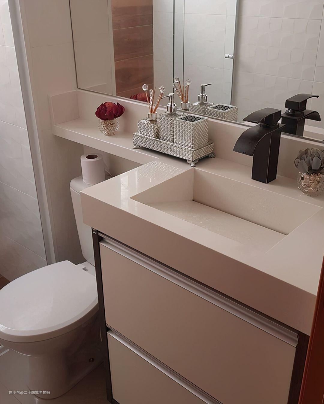 小卫生间,做成的台面相对也比较窄,增加了马桶后方的置物台,有些洗漱用品就可以挪到这边,让整个洗漱台显得更加的整洁。增加储物的同时,拿取也能更加的便利。