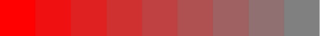 那么纯度呢?纯度也叫饱和度。比如说一个颜色,你说不太清楚,“灰不溜秋,绿了吧唧”,或者有时候我们故意搞笑恶作剧,会说“鸡屎绿”、“鸟屎黄”,其实就是色相上它主要是绿色/黄色,但是和其他颜色掺和,所以纯度低。这里拿正红色举个例子,从左到右,当调进了其他乱七八糟的颜色之后,它的纯度就递减。