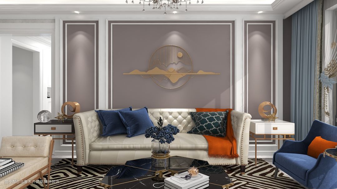 在软装上,简约的轮廓中融入鲜明的色彩元素。整体以饱和色做反差,大面积的灰色与橙、蓝相互吸引,配以装饰画点缀,渲染上一层奢华与浪漫的气息。