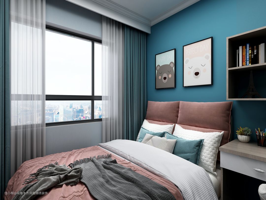 房间主体为梦幻蓝,为孩子营造出童话般的世界,丰富了孩子的想象力,小熊的装饰画为房间增添了几分童真。