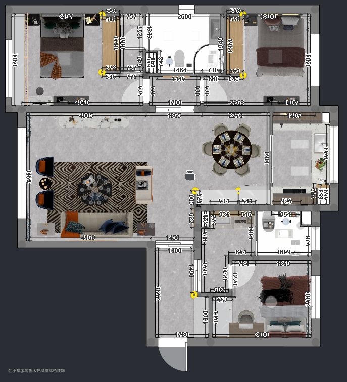业主需求:追求时尚,家里有小孩,父母经常会来家里照顾小孩子,后期东西物品可能会比较多,希望多一些收纳空间,希望有小两口的私密空间。