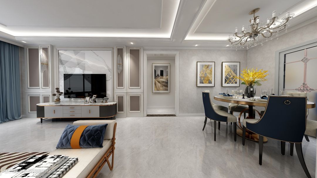 轻奢风的餐桌椅与奢华的吊顶灯相呼应,餐边柜的设计也是为了满足业主的收纳需求,打造了更多的收纳空间。