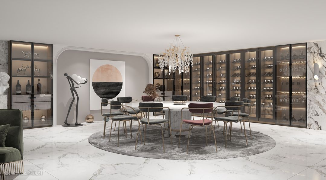 🍇U字型酒柜设计一般是放在地下室的位置,单独做了一个酒窖。底下酒窖在恒温、闭关、防震等方面具有得天独厚的条件优势。