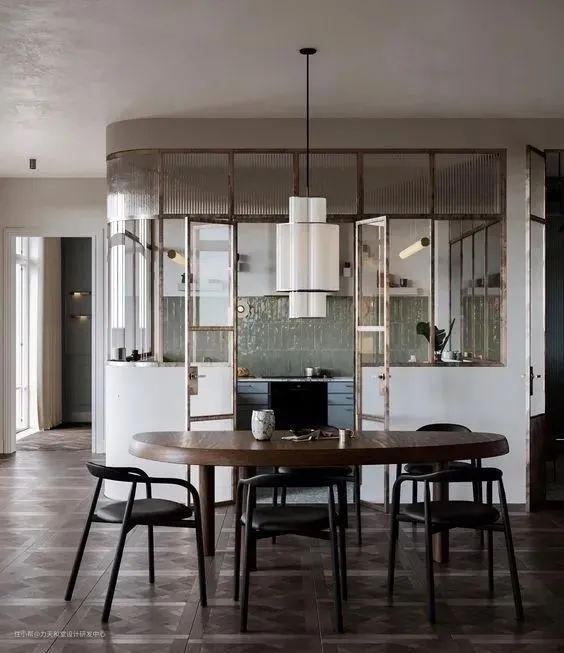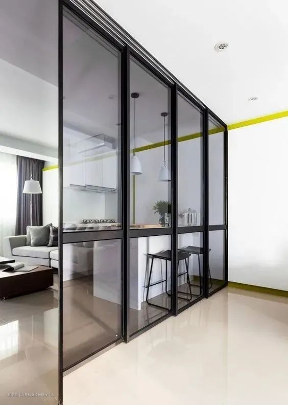 这种设计展现出来的效果,开门是开放式空间,关门就是封闭式空间,两种转换+玻璃材质不会显得空间拥挤,缺乏通透感,反而对于习惯爆炒的居住者相当友好,毕竟这玻璃推拉/折叠门在一开一合之间就把这些问题都解决。