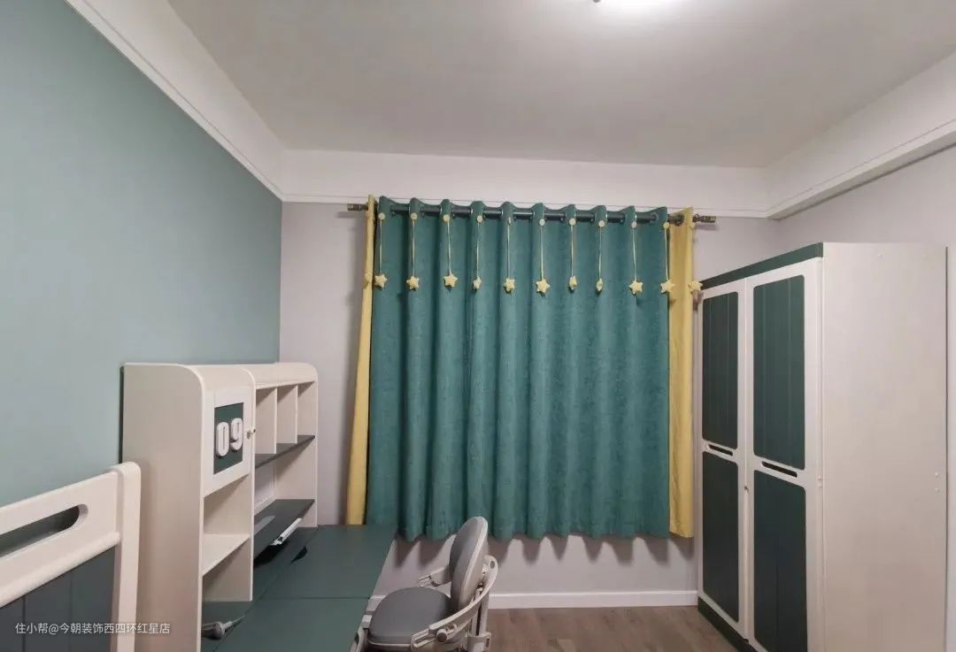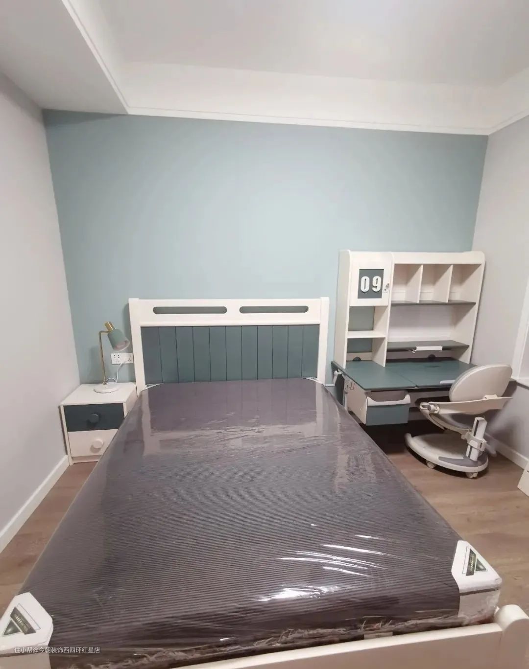 小孩房布置了一张单人床,旁边的位置刚好可以放书桌柜,非常方便使用,大小位置刚好合适,以后家里小孩写作业或者看书,都很方便。