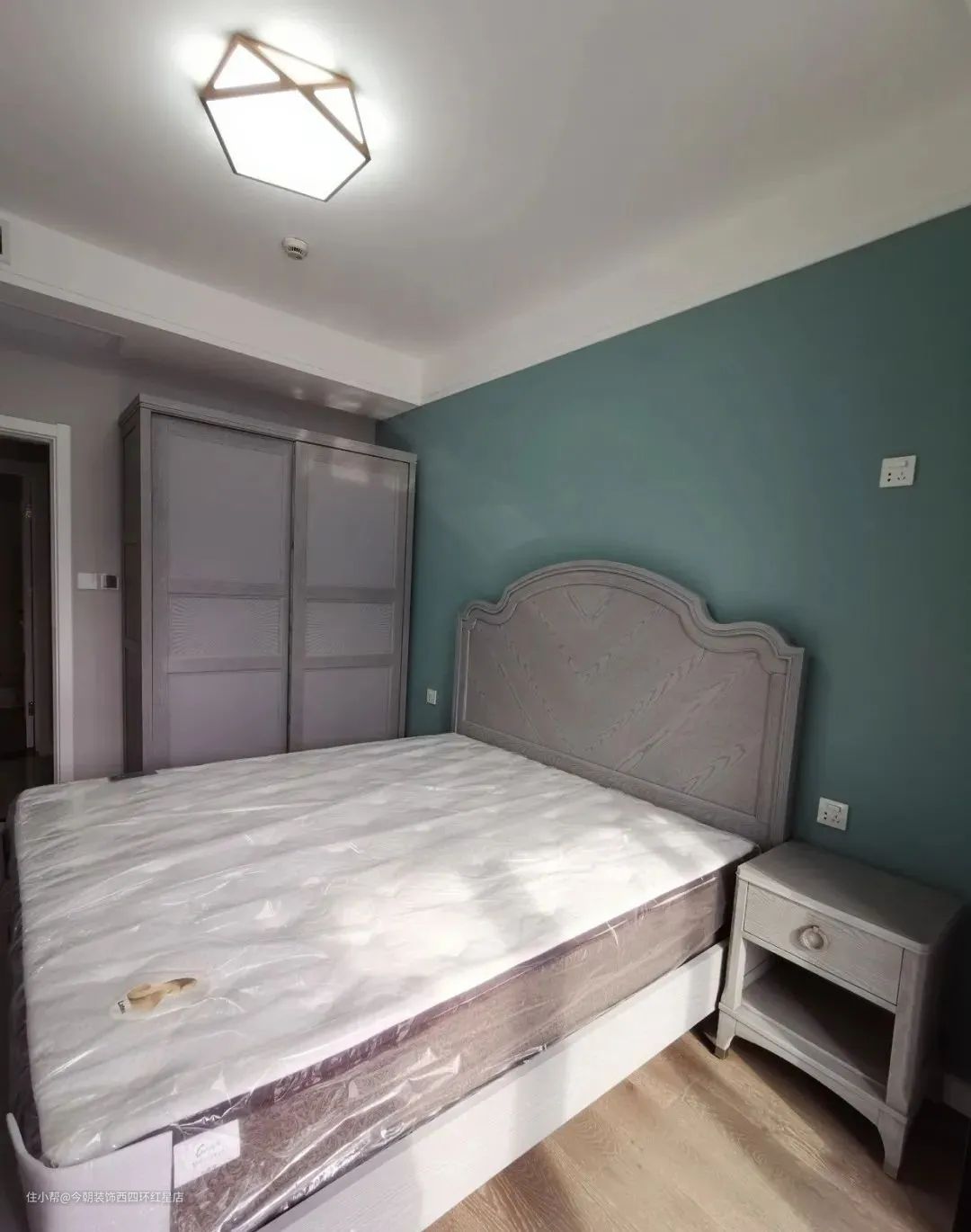 次卧床头背景墙刷了蓝色乳胶漆,其他墙面刷的是灰色,效果更漂亮。窗帘后面有独立的阳台,白天的时候,收起窗帘,采光非常光亮。空间不大,一张大床加上一个衣柜,基本没有什么多余的空间。
