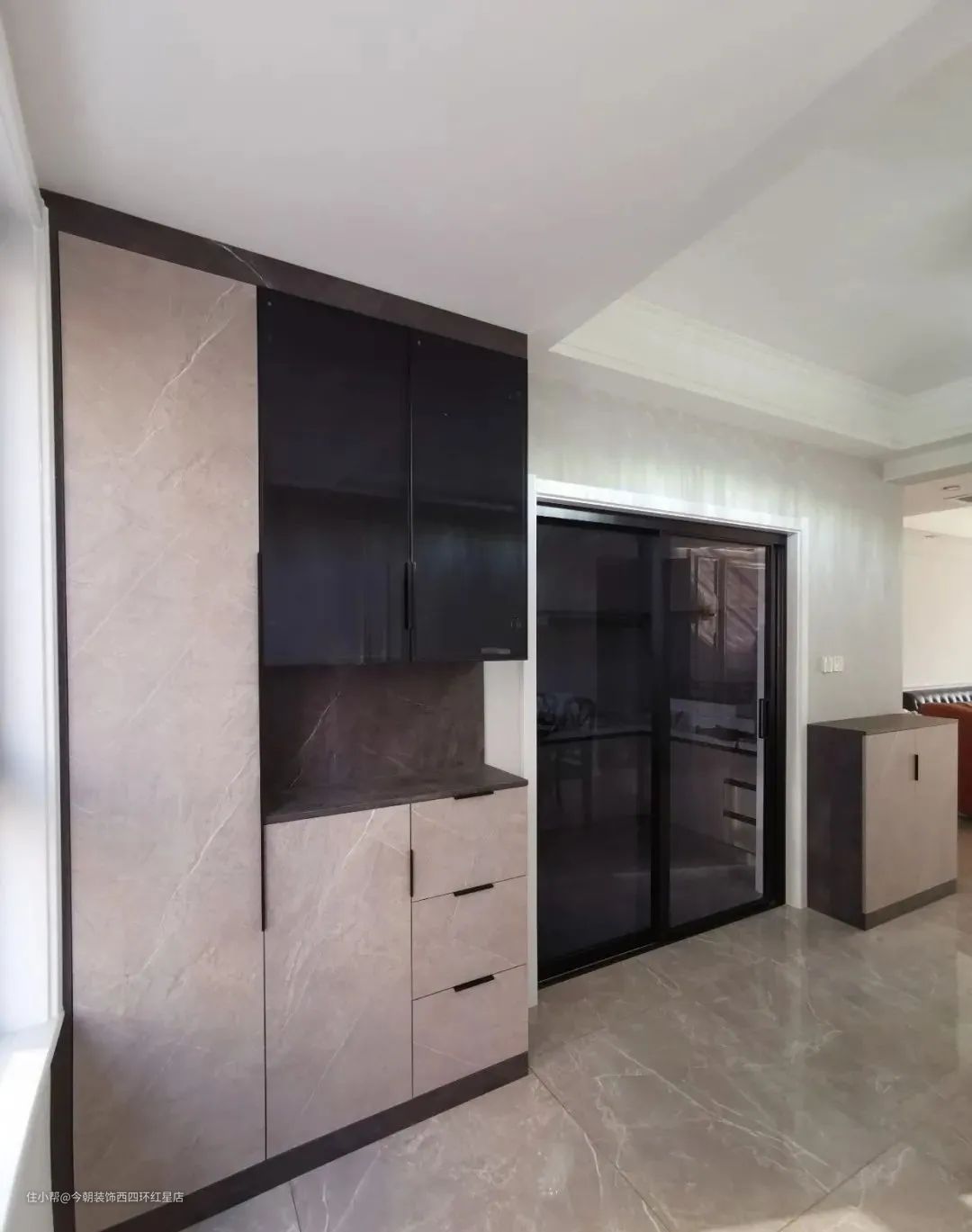 餐厅两边都布置了柜子,也就是厨房门两边的区域没有浪费空间。定制一大一小的餐边柜,可以起到很好的视觉效果,错落有致的感觉,非常实用。以后生活过程中,东西再多,都能装起来!