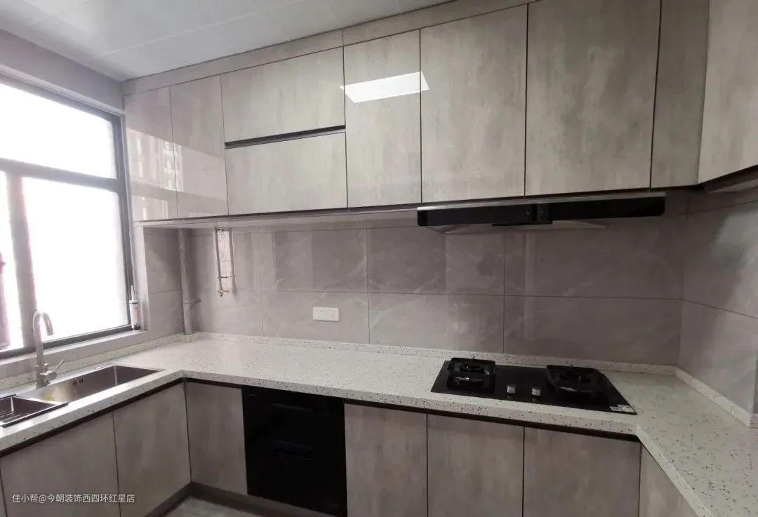 厨房定制了“U”字型的橱柜,刚好把厨房空间利用起来。水槽与燃气灶布局形成了“洗、切、炒”的顺序,特别方便使用。安装了石英石的台面,耐脏,做保洁也方便很多。水槽安装在靠窗位置通风性更好,并且采光也很好,洗菜洗碗的时候,可以眺望窗外,心情得到适当放松,减缓一些压力!