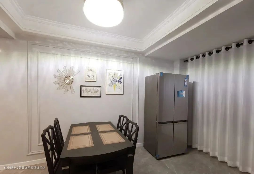 客厅沙发背景墙贴了石膏线条,显得没有那么单调,与墙上的挂画完美搭配。美式风格在硬装部分上,相对比较简洁,加上美式风格的家具,给人一种非常稳重,舒适感,特别满意。坐在餐桌椅,与家人一起用餐,很幸福。