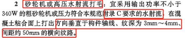2、砂轮机或高压水射流打毛:宜采用输出功率不小于340W的粗砂轮机或压力符合本规范附录C要求的水射流,在混凝土粘合面上打出方向垂直于构件轴线、纹深为3mm ~ 4mm、间距约50mm的横向纹路。