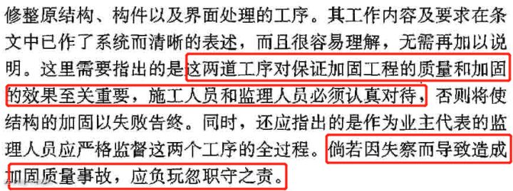 在GB50550-2010《建筑结构加固工程施工质量验收规范》条文说明中,3.0.4、3.0.5中明确表示,建筑结构加固工程与新建工程相比增加了清理、修整原结构、构件以及界面处理的工序。这里需要指出的是这两道工序对保证加固工程的质量和加固的效果至关重要,施工人员和监理人员必须认真对待。监理人员应严格监督这两个工序的全过程,倘若因失察而导致造成加固质量事故,应负玩忽职守之责。
