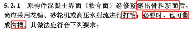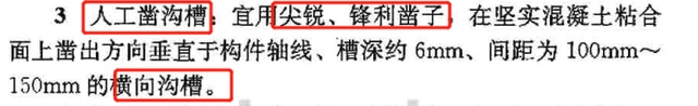 3、人工凿沟槽:宜用尖锐、锋利凿子,在坚实混凝土粘合面上凿出方向垂直于构件轴线、槽深约6mm、间距为100mm ~150mm的横向沟槽。