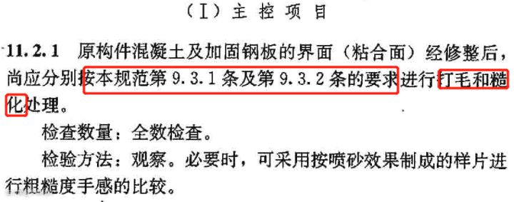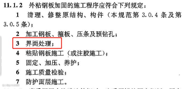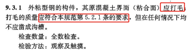 再看下,在GB50550-2010《建筑结构加固工程施工质量验收规范》中关于粘钢法的基面处理要求应该满足第5.2.1条的要求,且在任何情况下均不应凿成沟槽。
