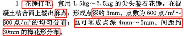 1、花锤打毛:宜用1.5kg~2.5kg的尖头錾石花锤,在混凝土粘合面上錾出麻点,形成点深约3mm、点数为600点/m2~800点/m2的均匀分布;也可錾成点深4mm~ 5mm、间距约30mm的梅花形分布。