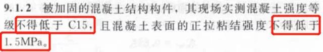 不同点1:这里未对基面做过多要求,但规定现场实测混凝土强度等级不低于C15,且表面正拉粘结强度不低于1.5MPa。而GB50367-2013《混凝土结构加固设计规范》中增大截面法中规定,混凝土的现场实测强度不应低于C13。