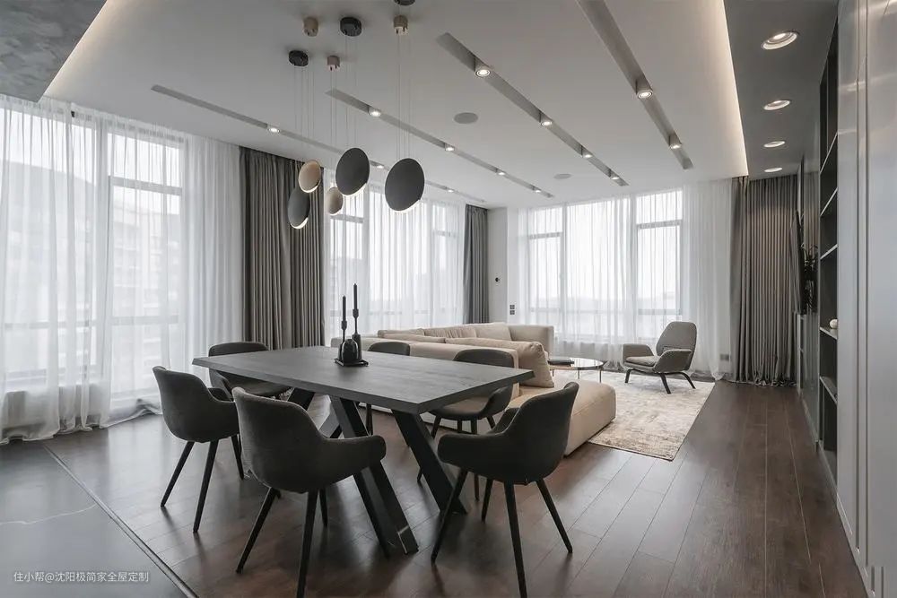 装修效果图:今天一起来欣赏一组充满精英时尚感的170平现代轻奢风格新房装修案例。落地窗+大横厅,采光绝了!客餐厅一边的收纳柜,大气实用,一起往下看吧!