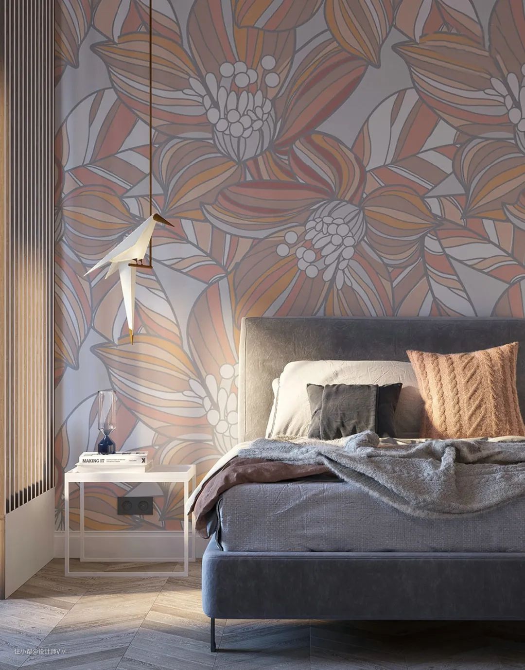 ▲卧室床头墙是一整幅的鲜花图案墙布,温馨中性色,搭配灰色布艺床铺,让睡眠空间显得充满温情浪漫的气质感。