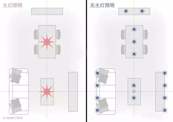 有主灯的照明,一盏顶灯控制整个空间,除了灯具自带了灯光明暗色彩调节外,无法控制局部空间,光线死角较多。