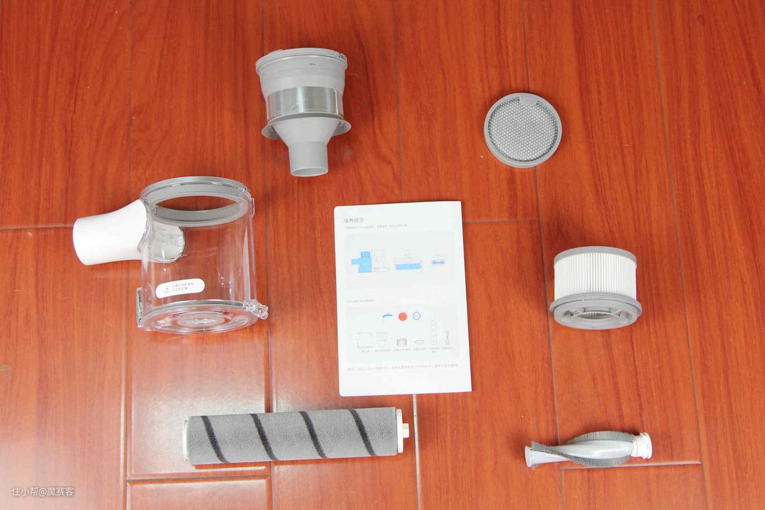 ▲看下全家福,除了产品说明书和保修卡,还有吸尘器主机、四刷头(扁嘴吸、二合一毛刷、电动除螨刷、软绒滚刷)、合金硬连接管、弹簧软连接管、收纳架、充电头。