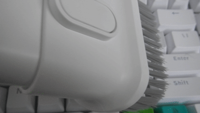 ▲按压后可进行推拉切换刷头:毛刷可以用来清理软布、电子屏幕、键盘等,宽嘴吸头则可以用来清理桌面、书柜等较大的异物或颗粒。