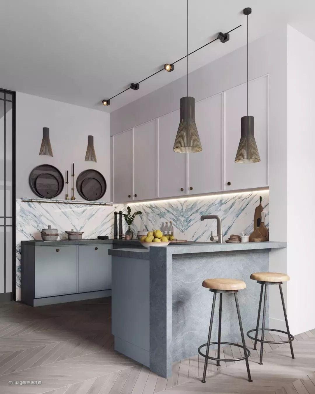 灯光的设计也是能够提升小户型厨房颜值的,在主灯的前提下,加上灯带、筒灯、吊灯等不同的局部的灯源设计,既让厨房更美观又方便日常使用。