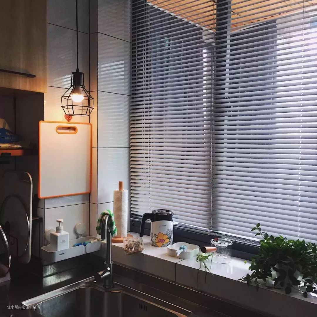 小户型厨房的收纳可以不用吊柜,毕竟墙面做满柜子容易造成压抑感,推荐用隔板、挂篮等代替,拿取东西也方便一些。