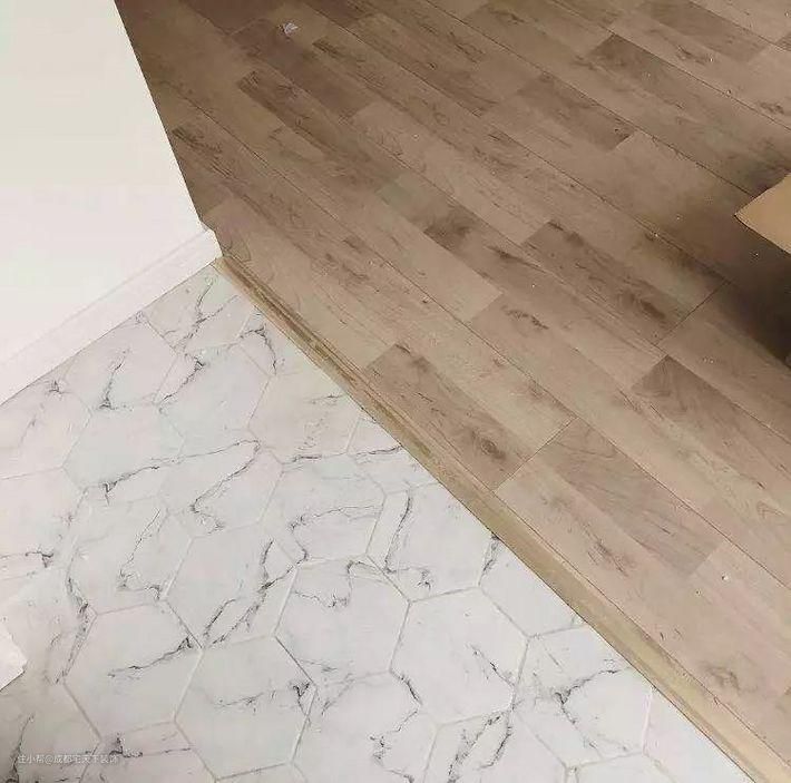 两个空间利用不同材料铺设,这样在衔接的地方,自然而然的就出现过渡的情况,门槛石可以直接去除了。