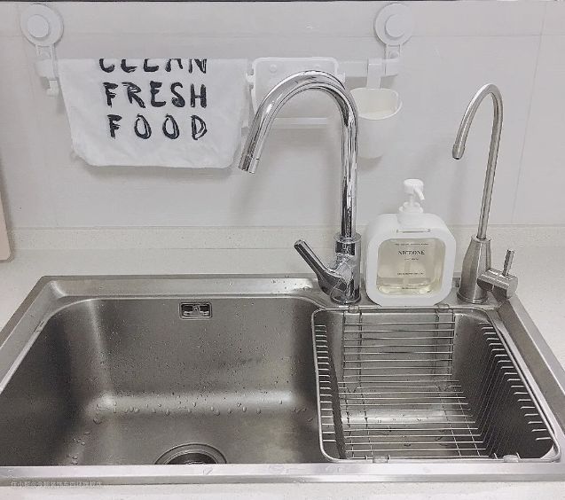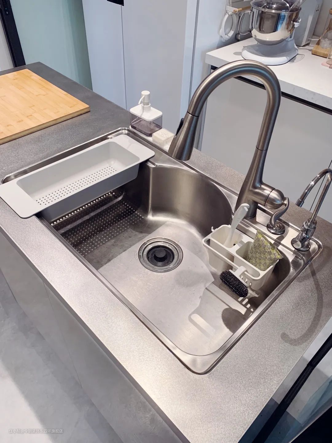 双水槽适合懒人,可以分区,更卫生。一个槽用来浸泡食材,还有一个槽可以清洗使用,两个水槽各司其职用来满足日常需求可以说是妥妥的。但要注意尺寸,大水槽的长度要≥35cm,毕竟一般的砧板和锅的尺寸都在28-40cm之间,因此大的水槽在40cm左右最好用。