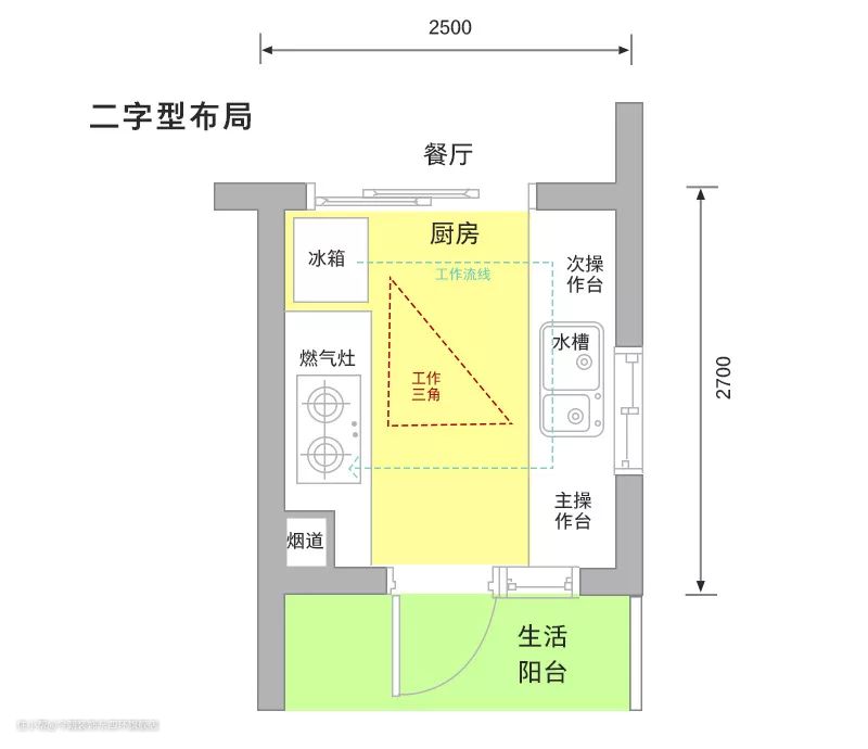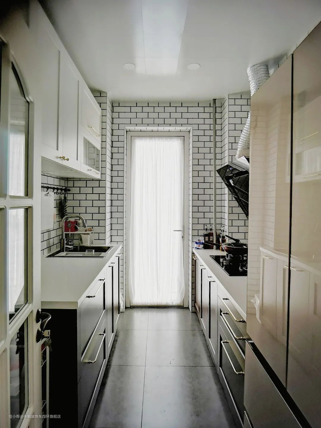 二字型的厨房空间更大,水槽和炉灶可以不用挤在一起,一边一个这样的布局最好。