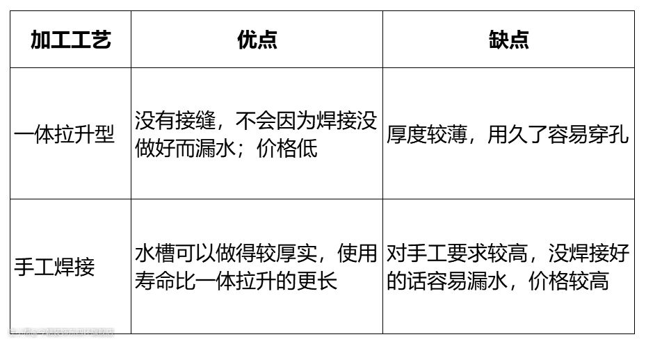 一体拉升和手工焊接都各有利弊,大家可以根据自己的预算按需选择。预算充足,闭眼选手工水槽,用几十年的没问题,但是手工水槽对工人的手艺有很高的要求,所以最好选择大品牌的,手艺起码有保障。