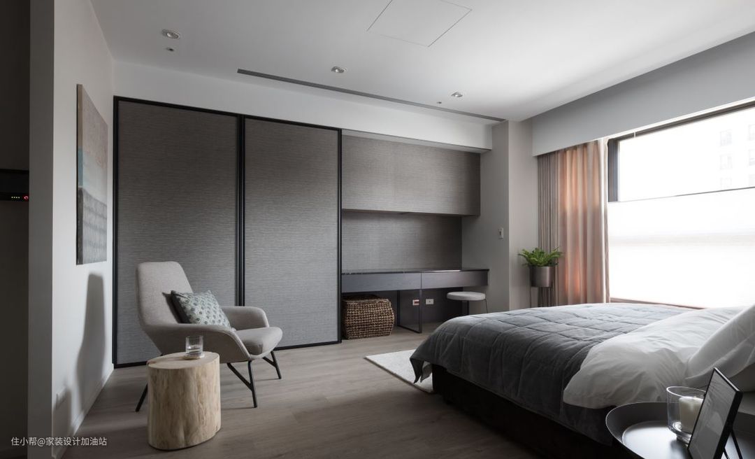 主卧继续延续客厅的风格,不做过多的装饰品,仅以灰色为主,里面配备了独立衣帽间。房间角落还放了休闲椅,可以在上面看书。窗户为了隐私,特意做了一扇磨砂玻璃,透光性好隐私性好。