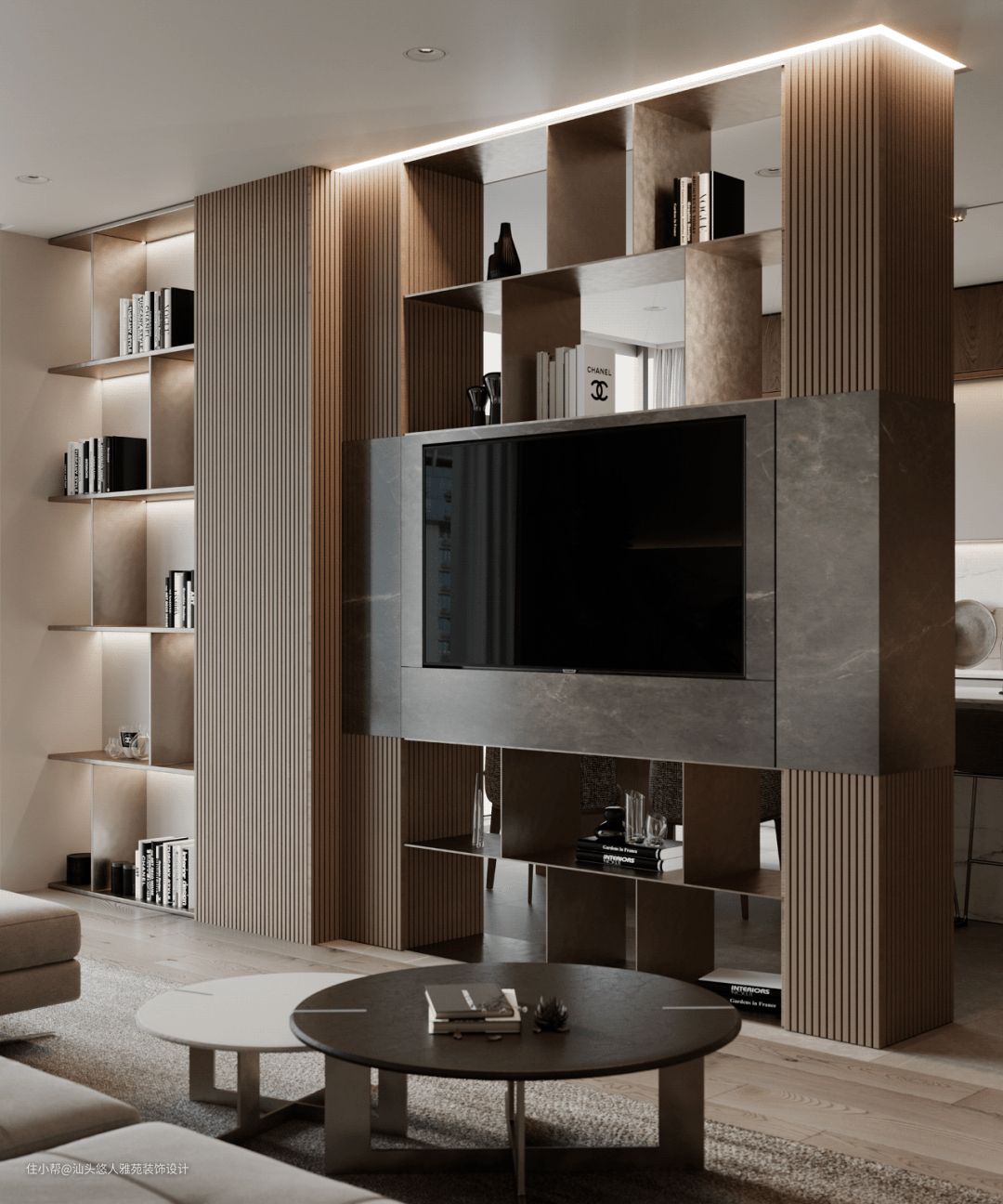 以白色与灰色为主色调的客厅,十分沉稳,灰色的沙发搭配大理石背景墙,生动不死板,定制的书柜巧妙的将电视机嵌入,让人耳目一新,拓展了客厅的功能性,同时又作为隔断,隔离了客厅与餐厨空间,丰富视觉效果。