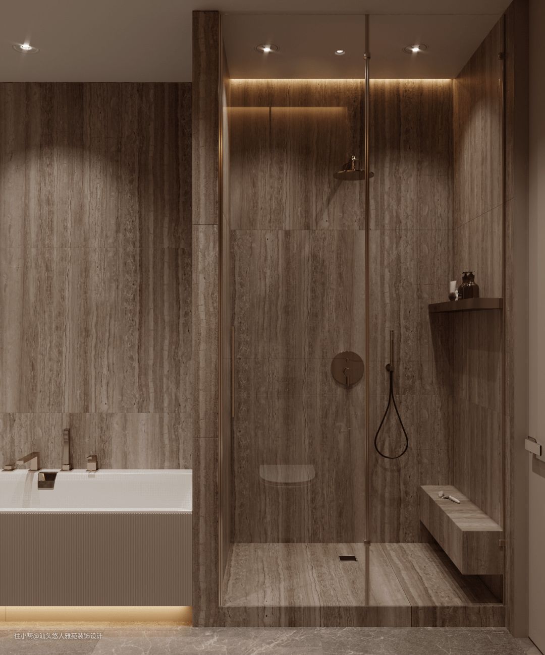 卫生间采用大理石和木饰面堆砌而成,高级感十足,干湿分离,布局合理,柔和的灯光,不强烈、不刺眼,打造干净纯粹的空间氛围。