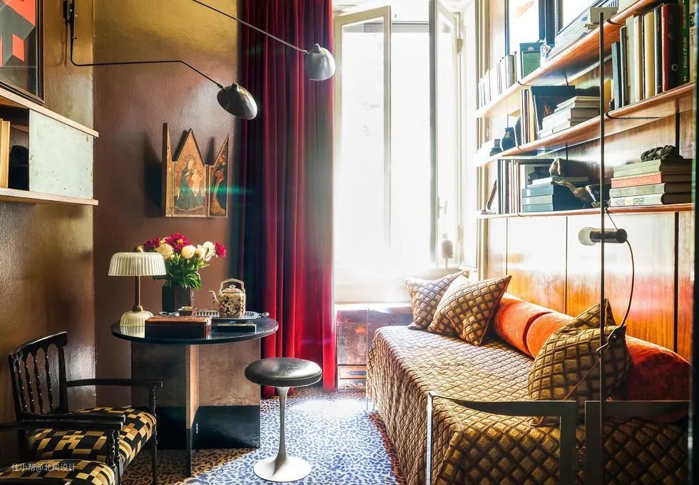 时尚感官被全数激活,大块浓郁的黑和棕与爱马仕橙对撞出别样的热情。在这份热情之中,又充盈惊艳的创造力。暖色调的中国红沙发与窗帘隔空“传情”,烤杏仁色豹纹地毯连带墙上部分装饰格外醒目,仿佛会在下一刻朝你飞奔而来。突出的金属框架结构有着冰冷的工业质感,也会加深深色轮廓的装饰个性,富有艺术氛围。