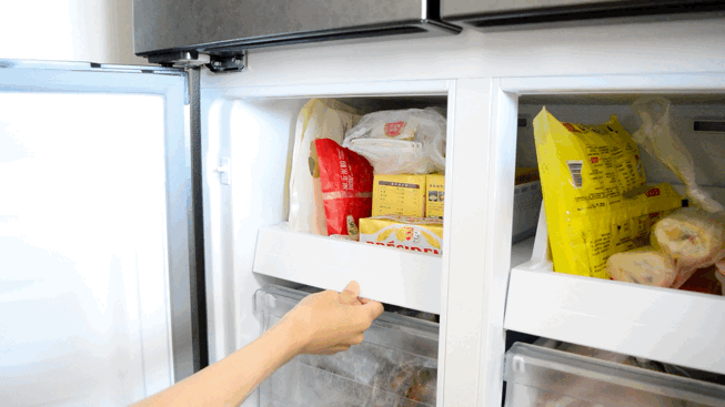 ▼有了更加精细的分区功能后,各种食材就能根据自己的属性各归其位啦!右侧的抽屉容量较大,可以放置各种肉类生鲜,左侧则放置各种熟食。做好分区后,每次拿取物品只需要打开一扇冰箱门就可以了,更加节能环保。