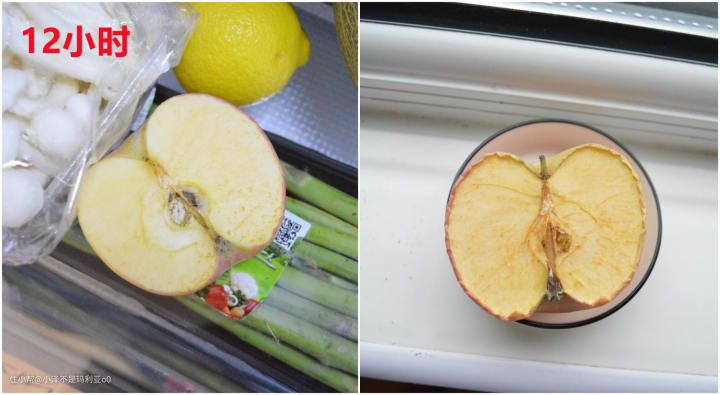 ▼放置12小时后,置于室内苹果表层的果肉已经完全干瘪,由于水分快速流失,整个苹果的体积也比之前小了整整一圈。左侧的半个苹果在湿度为90%的保鲜区放置了一整晚后,虽然表面出现了轻微的氧化现象,但果肉中依然保留了充足的水分,苹果的体积也几乎没有发生变化。