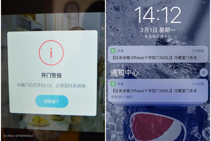 ▼冰箱门超过1分不关闭屏幕和手机就会同时发出提醒,并发出警报音,像小泽这样的马大哈再也不用担心忘记关冰箱门了。